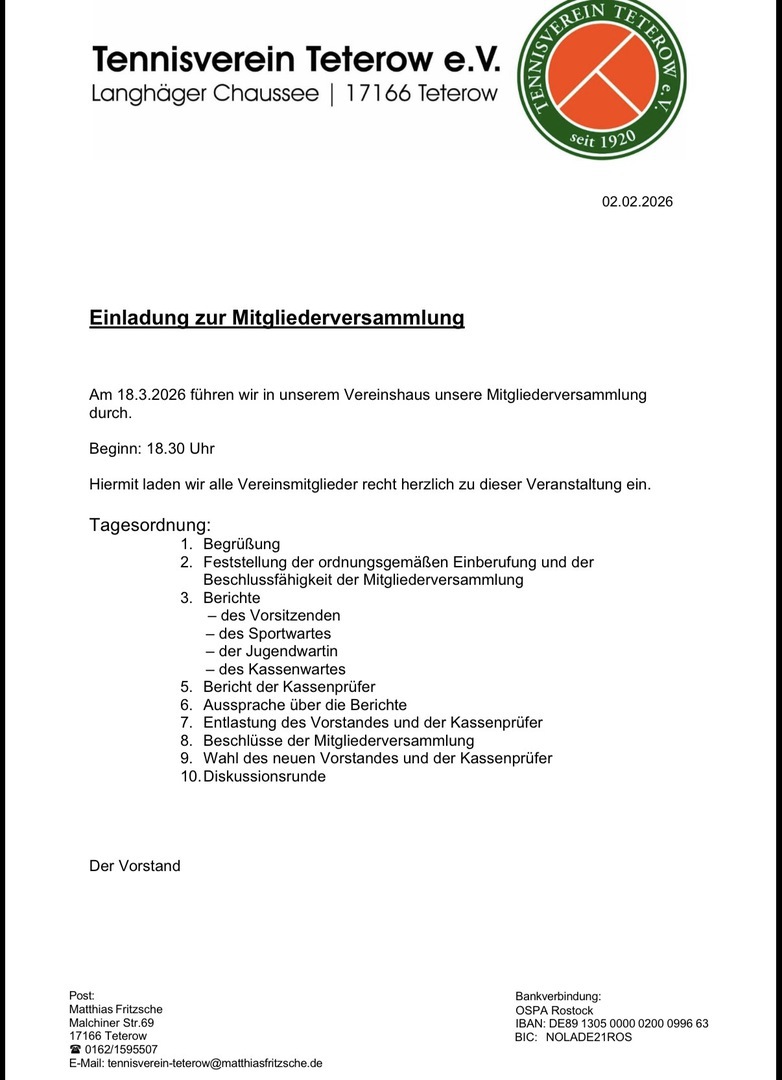 am 18.03.2026 um 18:30 Uhr findet die diesjährige Mitgliederversammlung statt. Unter anderen Themen wird dieses Jhr wieder der Vorstand neu gewählt. Wir trefen uns wie immer im Vereinshaus des Vereins in der Langhäger Chaussee 1 in Teterow.
